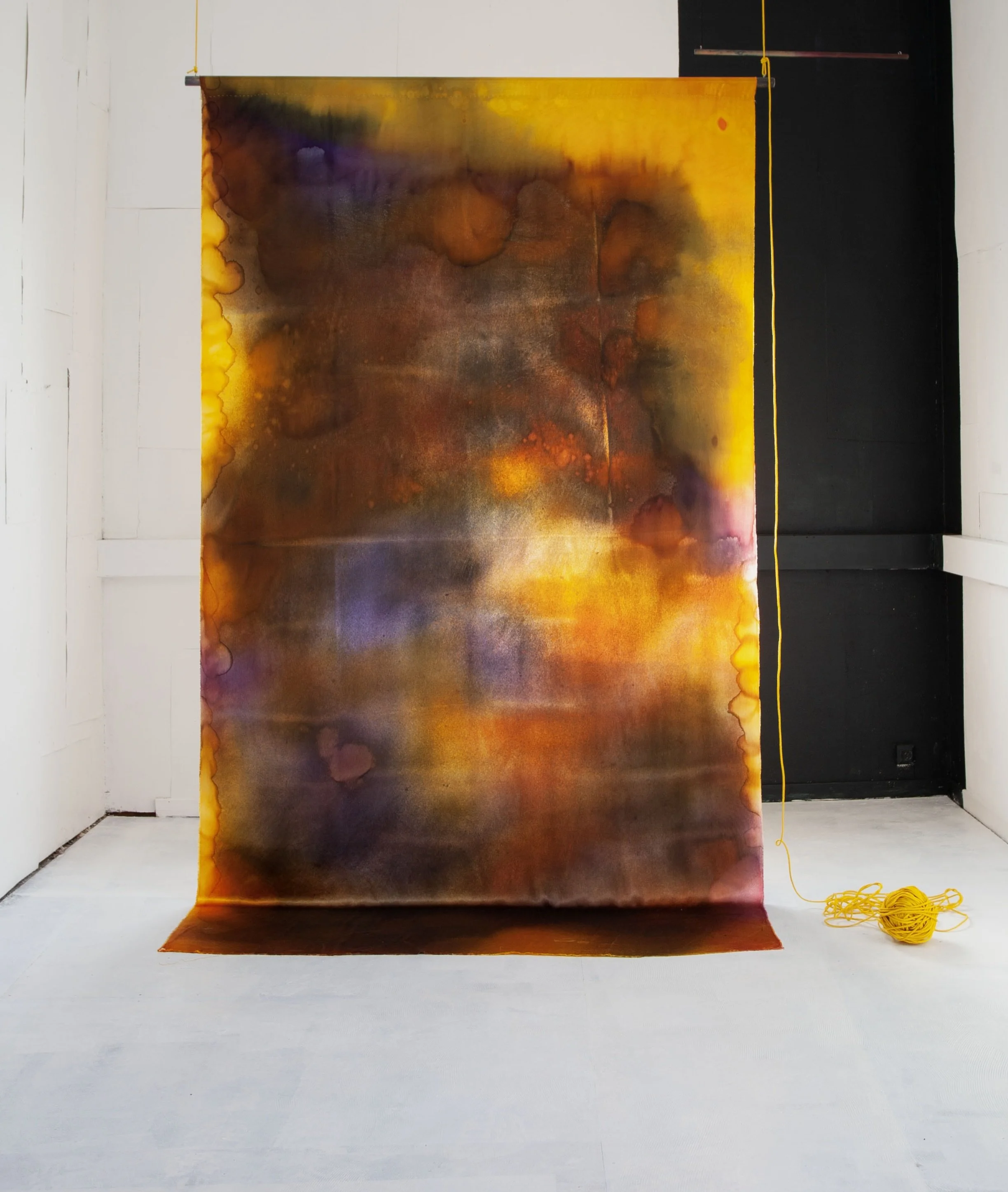 ”Tid er lys i forandring; epoker med velstand, med motgang, lyse og mørke kapittel i fortellingen om et liv. Jeg lager tablåer med tekstil, farge og arkitektoniske virkemidler for å antyde det gåtefulle i tilværelsens omskiftelighet”.